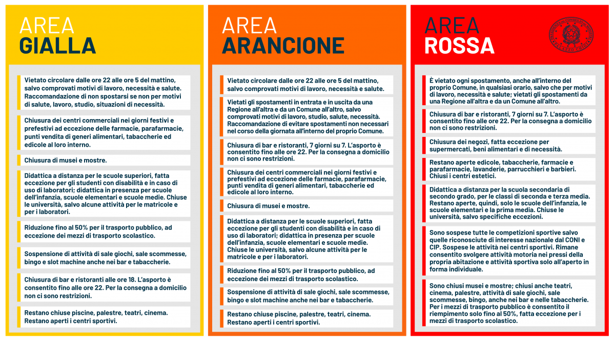 Nell'area gialla è previsto il coprifuoco dalle 22 alle 5 del mattino salvo comprovati motivi di lavoro, necessità e salute, con la raccomandazione di non spostarsi se non per motivi di salute, lavoro, studio, situazioni di necessità. Per i centri commerciali è prevista la chiusura nei giorni festivi e prefestivi ad eccezione delle farmacie, parafarmacie, punti vendita di generi alimentari, tabaccherie ed edicole al loro interno mentre mostre e musei sono sempre chiusi. Il Dpcm introduce poi la didattica a distanza per le scuole superiori, fatta eccezione per gli studenti con disabilità e in caso di uso di laboratori; mentre è prevista la didattica in presenza per scuole dell'infanzia, scuole elementari e scuole medie. Sono chiuse anche le università, salvo alcune attività per le matricole e per i laboratori. Per quanto concerne il trasporto pubblico è prevista una riduzione dei passeggeri fino al 50%, ad eccezione dei mezzi di trasporto scolastico. Le attività di sale giochi, sale scommesse, bingo e slot machine sono sospese. Per bar e ristoranti è prevista l'interruzione della somministrazione in sede dalle 18 mentre resta consentito l'asporto fino alle ore 22 e per la consegna a domicilio non ci sono restrizioni. Restano chiuse piscine, palestre, teatri, cinema. Restano aperti i centri sportivi.